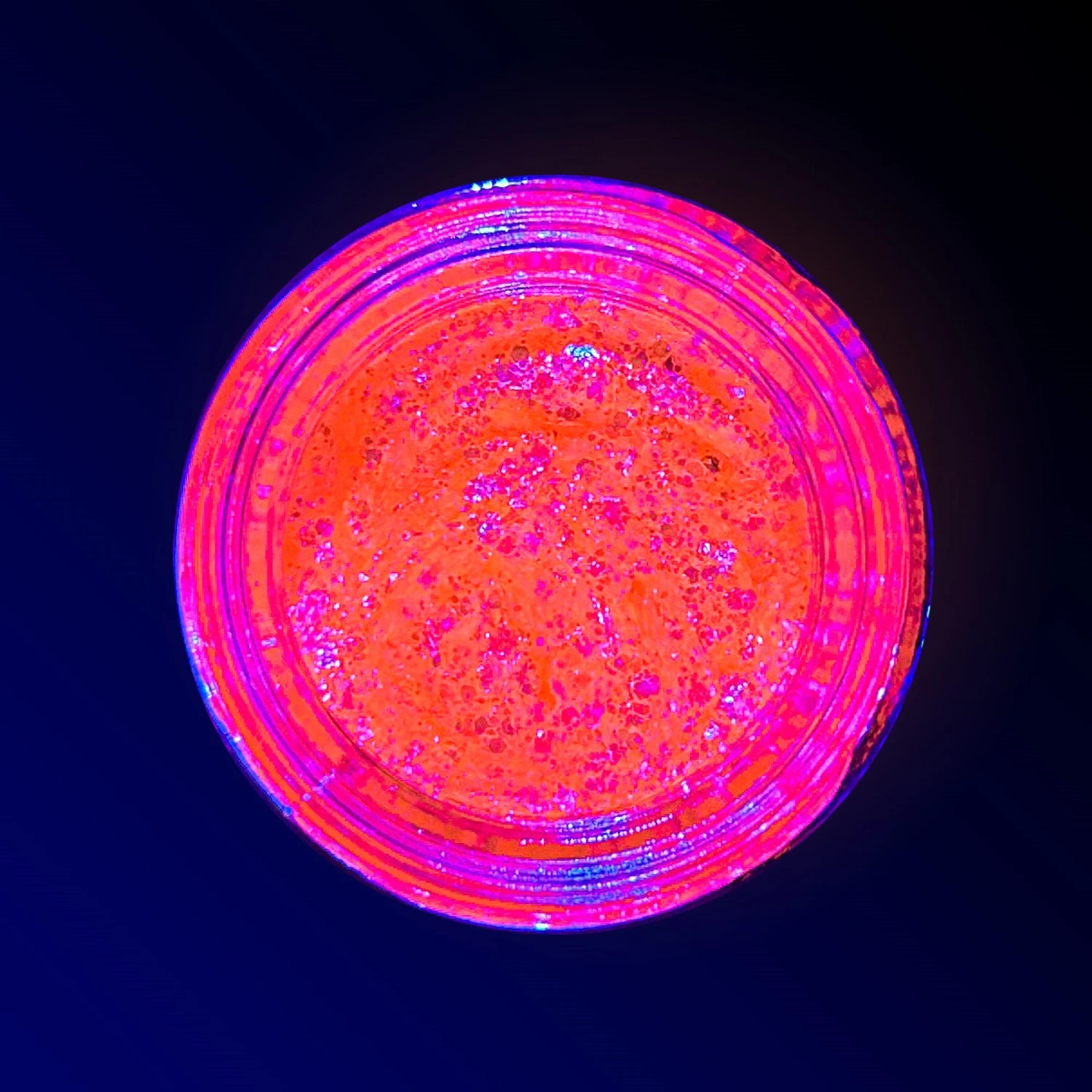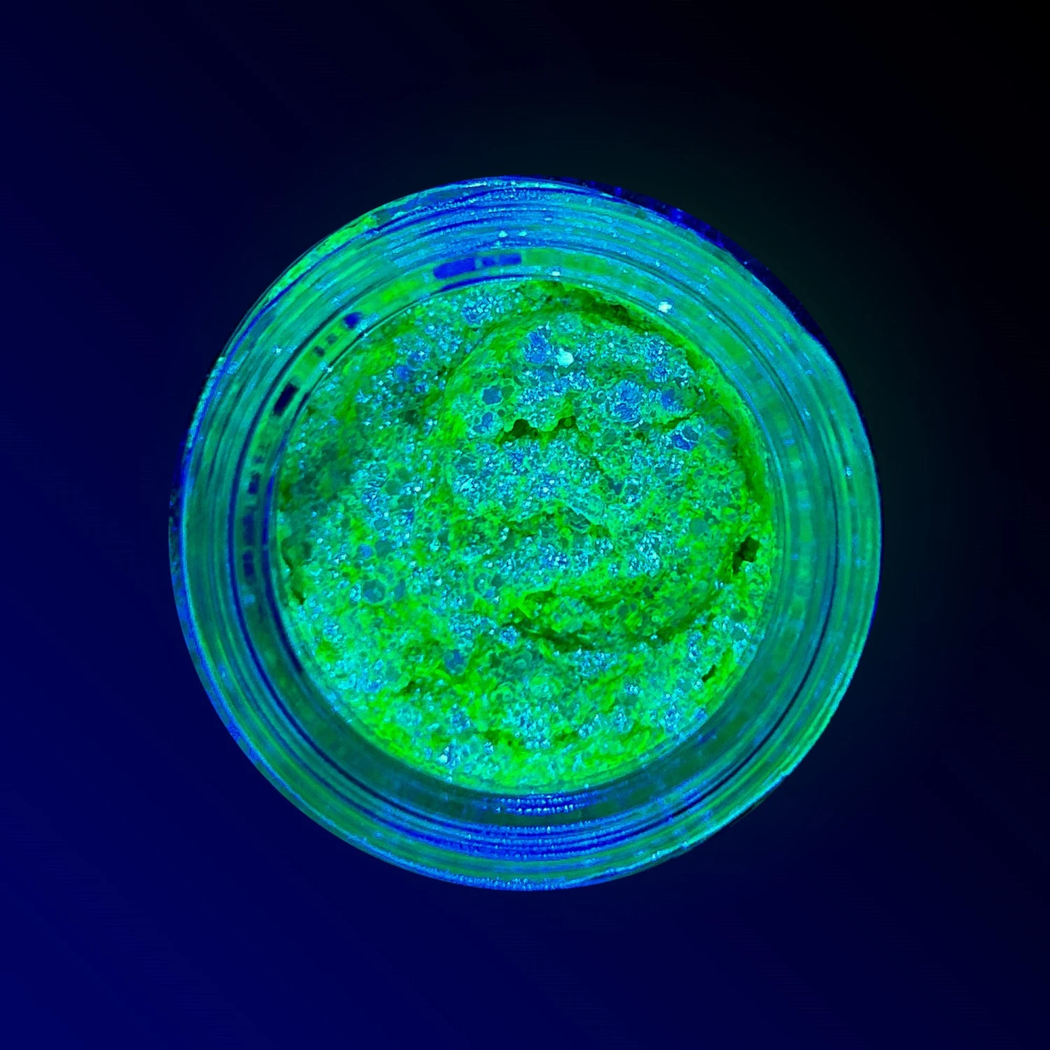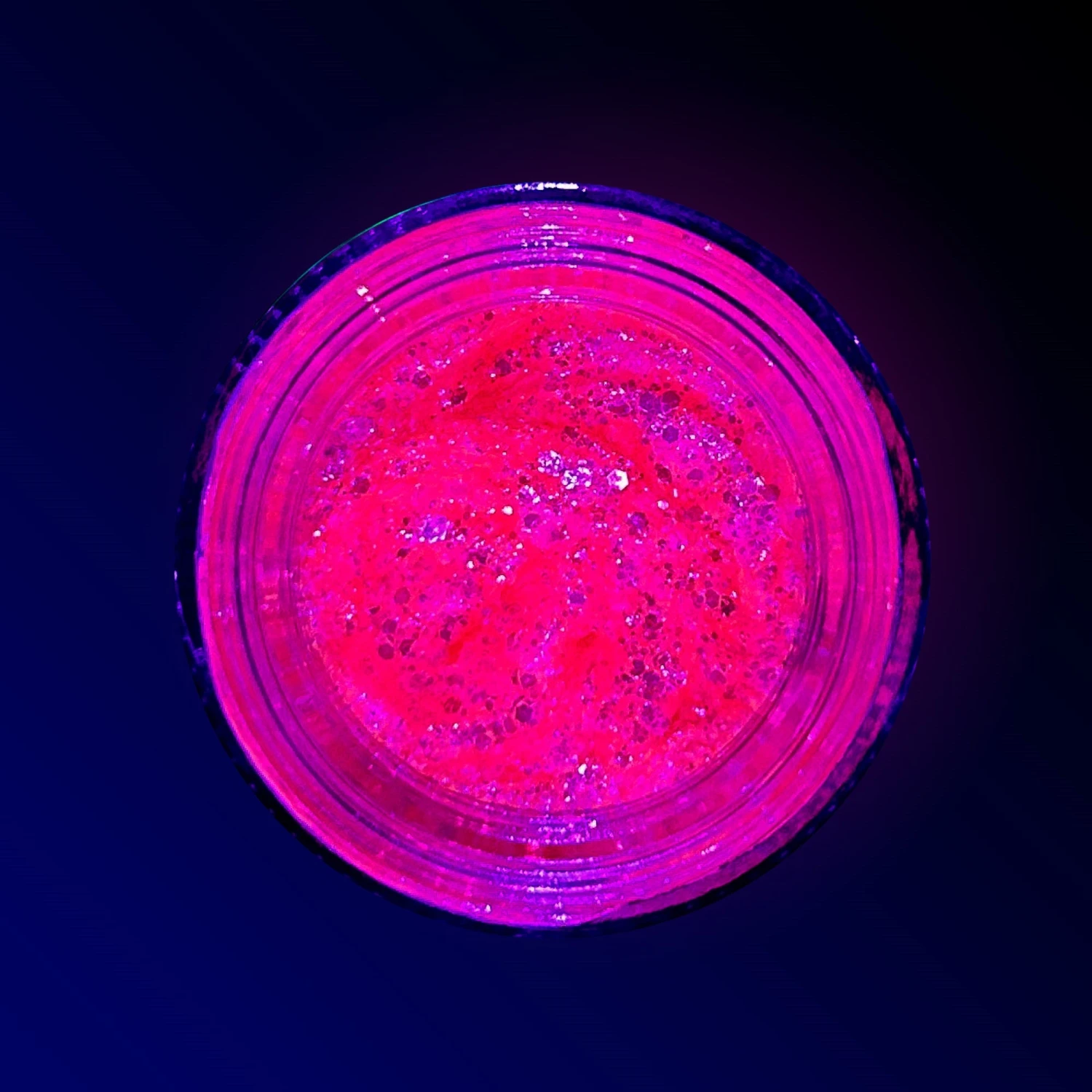 A light gel containing glitter pigment similar in texture to Spacepaste provides a sheer and pretty pastel affect in normal daylight and then glows under UV light making it perfect for editorials, runway and for personal use at festivals, parties & raves!